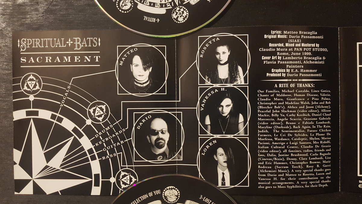 is based in Italy but has performed at several festivals in Europe, such as WGT, Whitby Goth Weekend, Return To The Batcave, Gotham Sounds, Castle Party. The project evolves from "The Spiritual BatS" (plural), conceived in 1992 and features artwork by the Alchemisti Painters.
